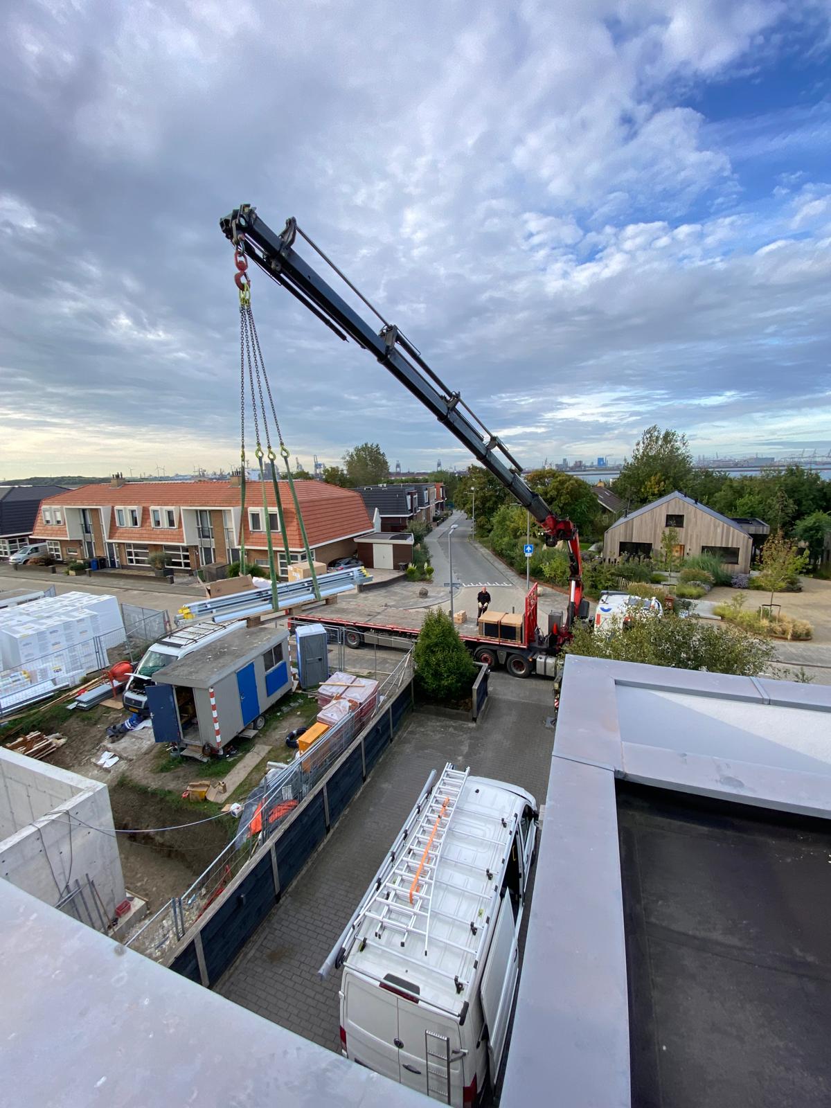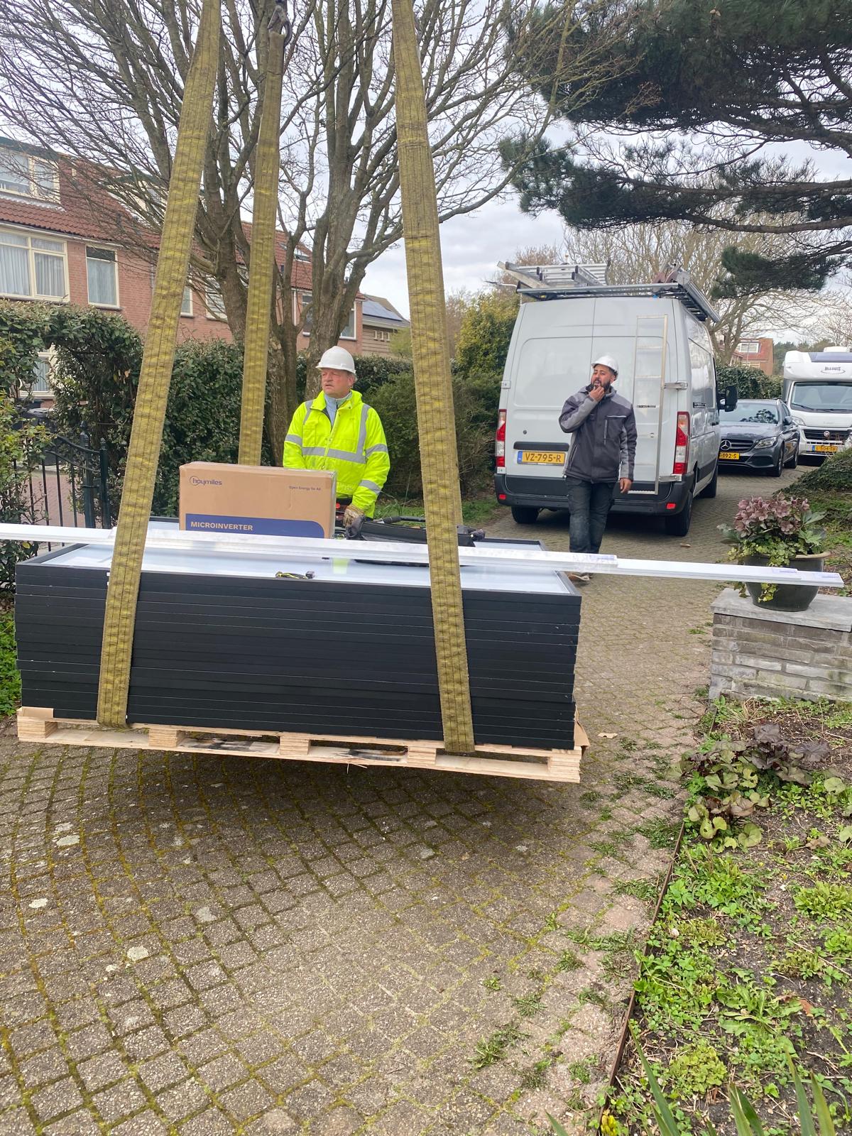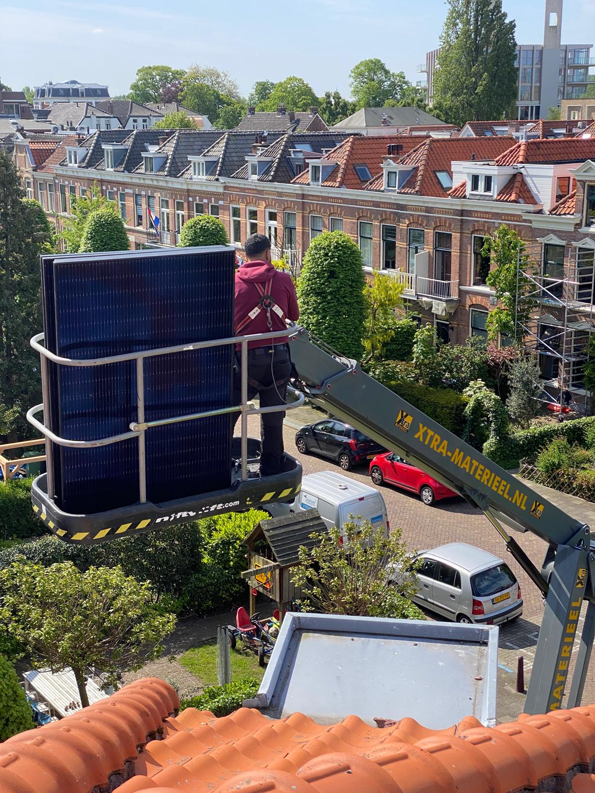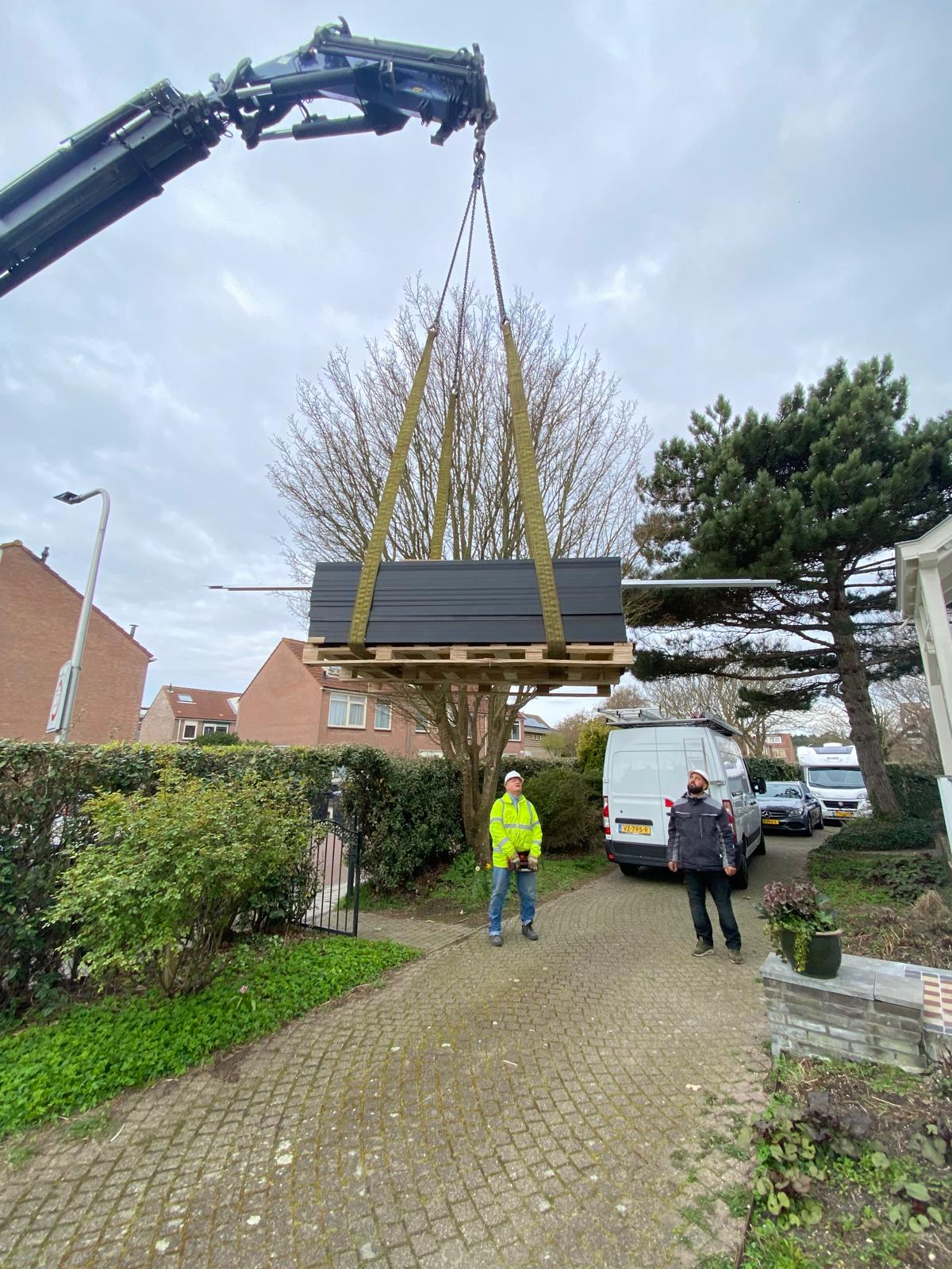 Bij een hoog dak worden de panelen met een kraan op het dak getild.