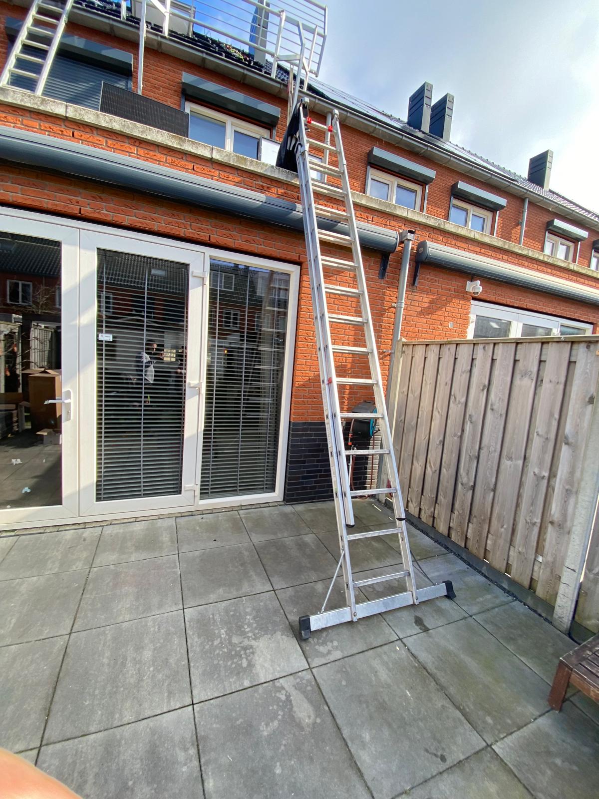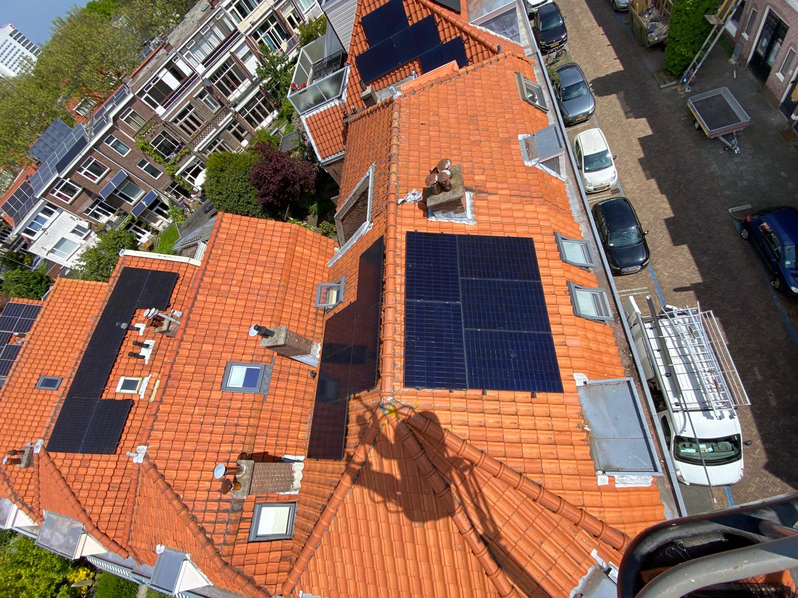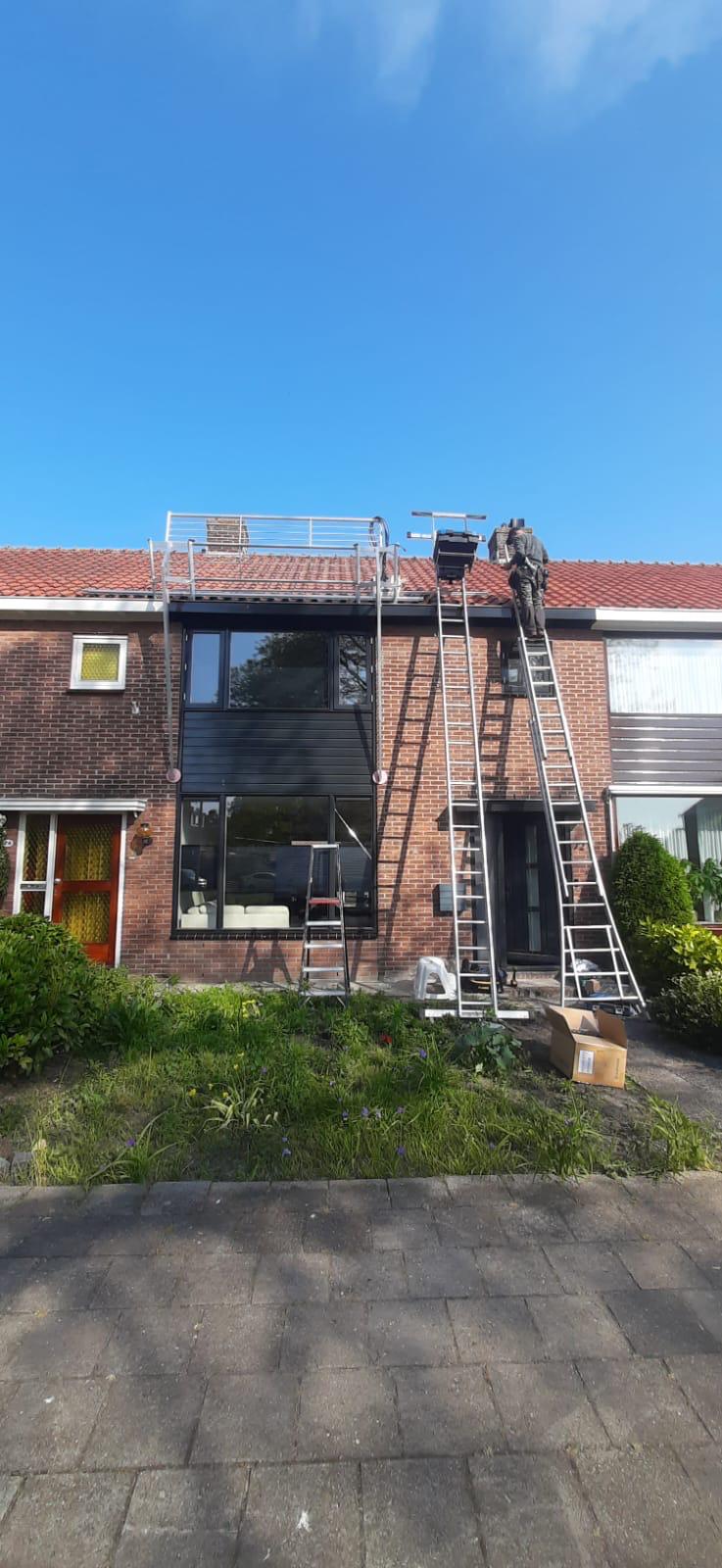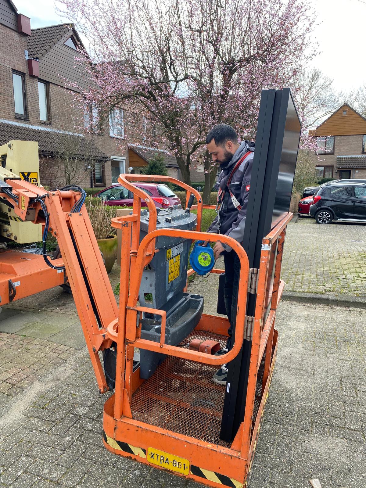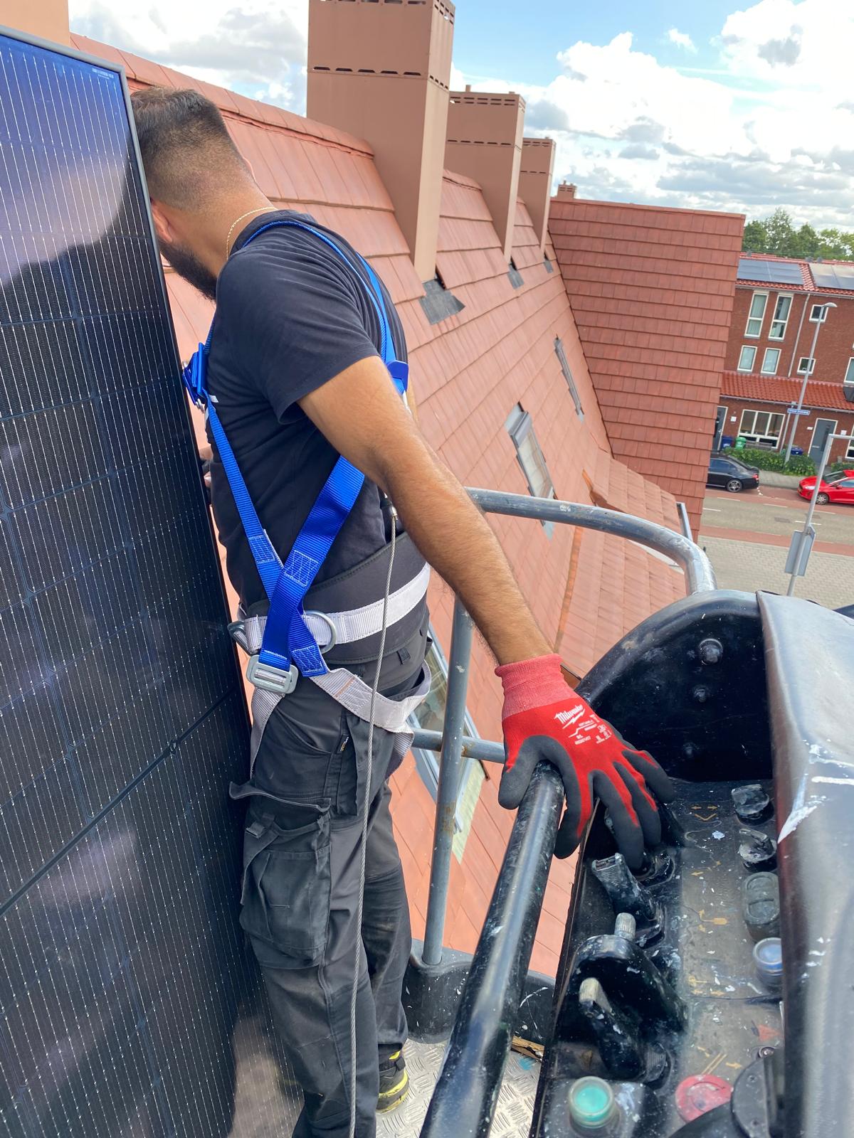 Bij een hoog dak worden de panelen met een kraan op het dak getild.