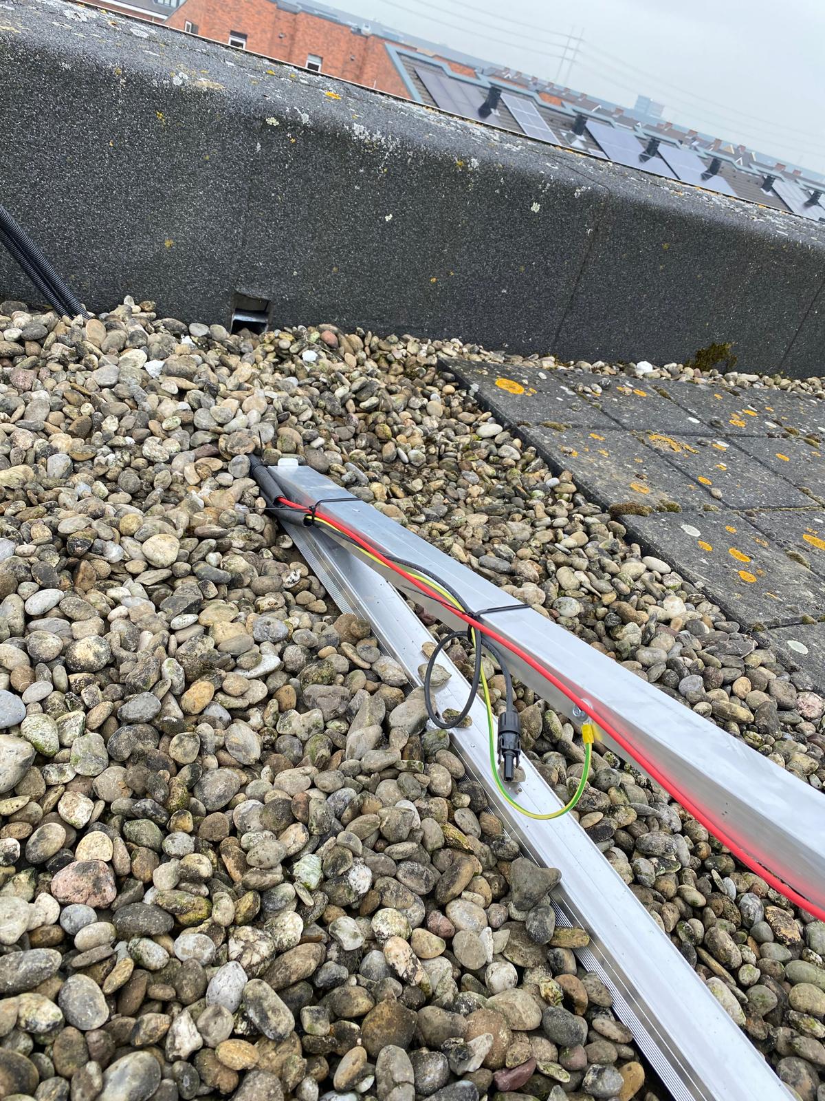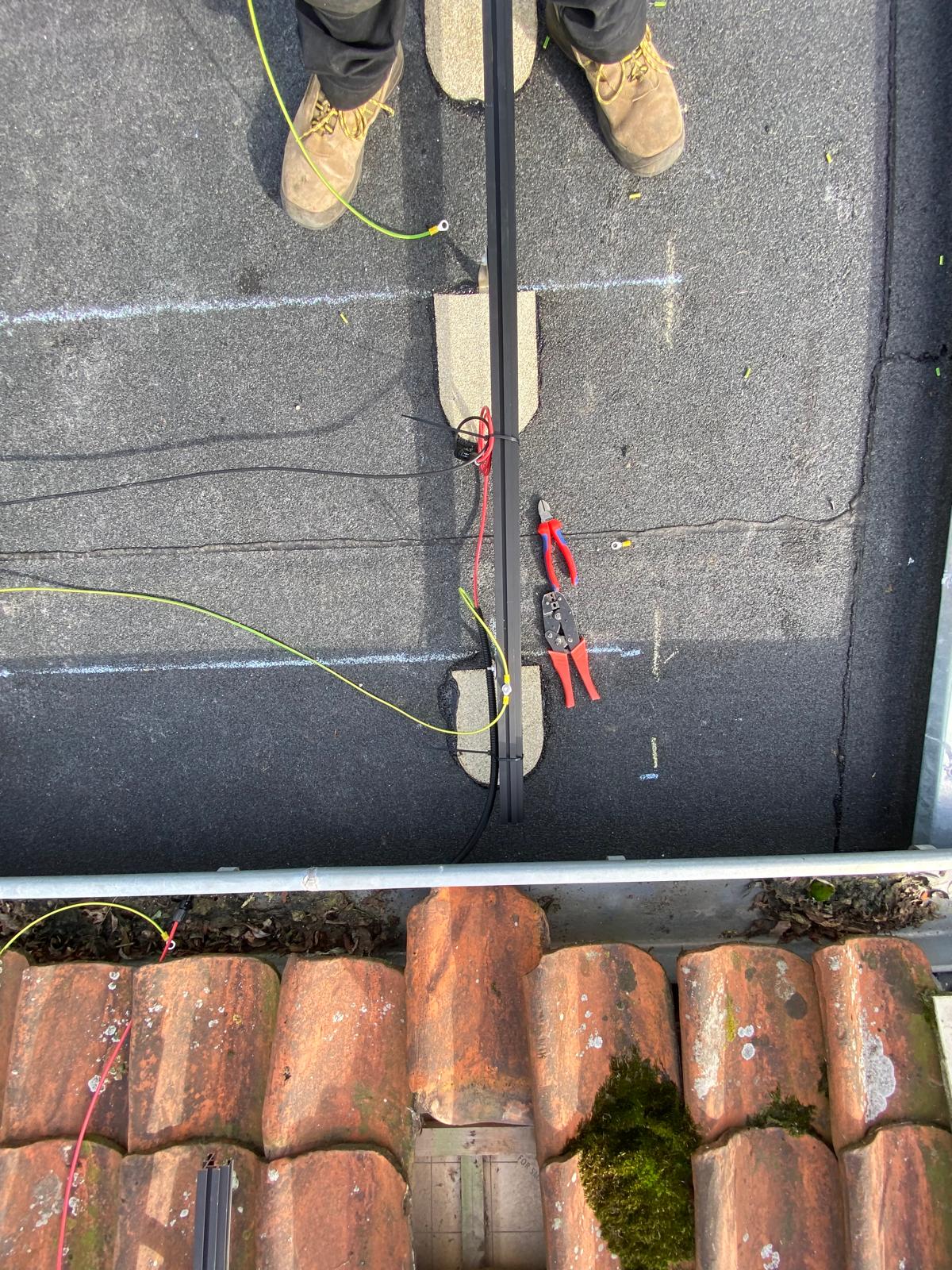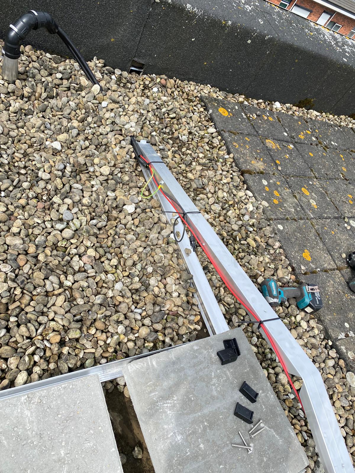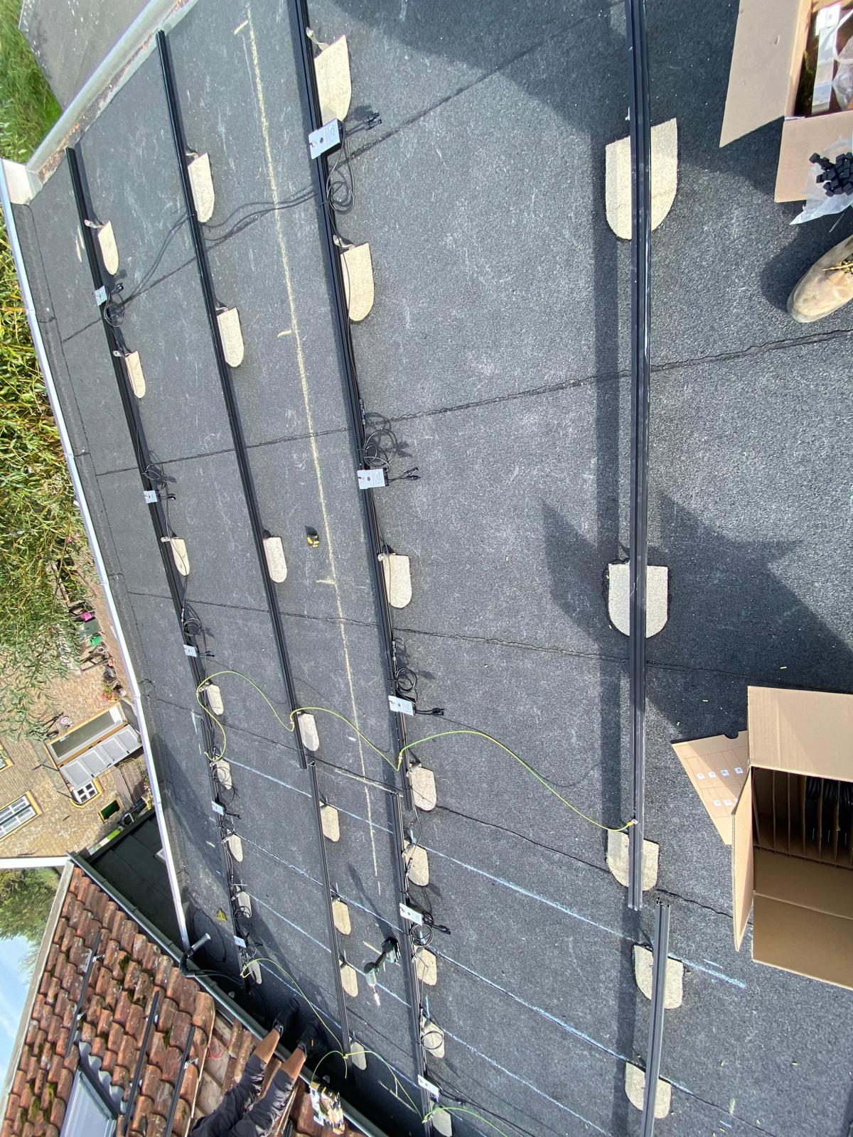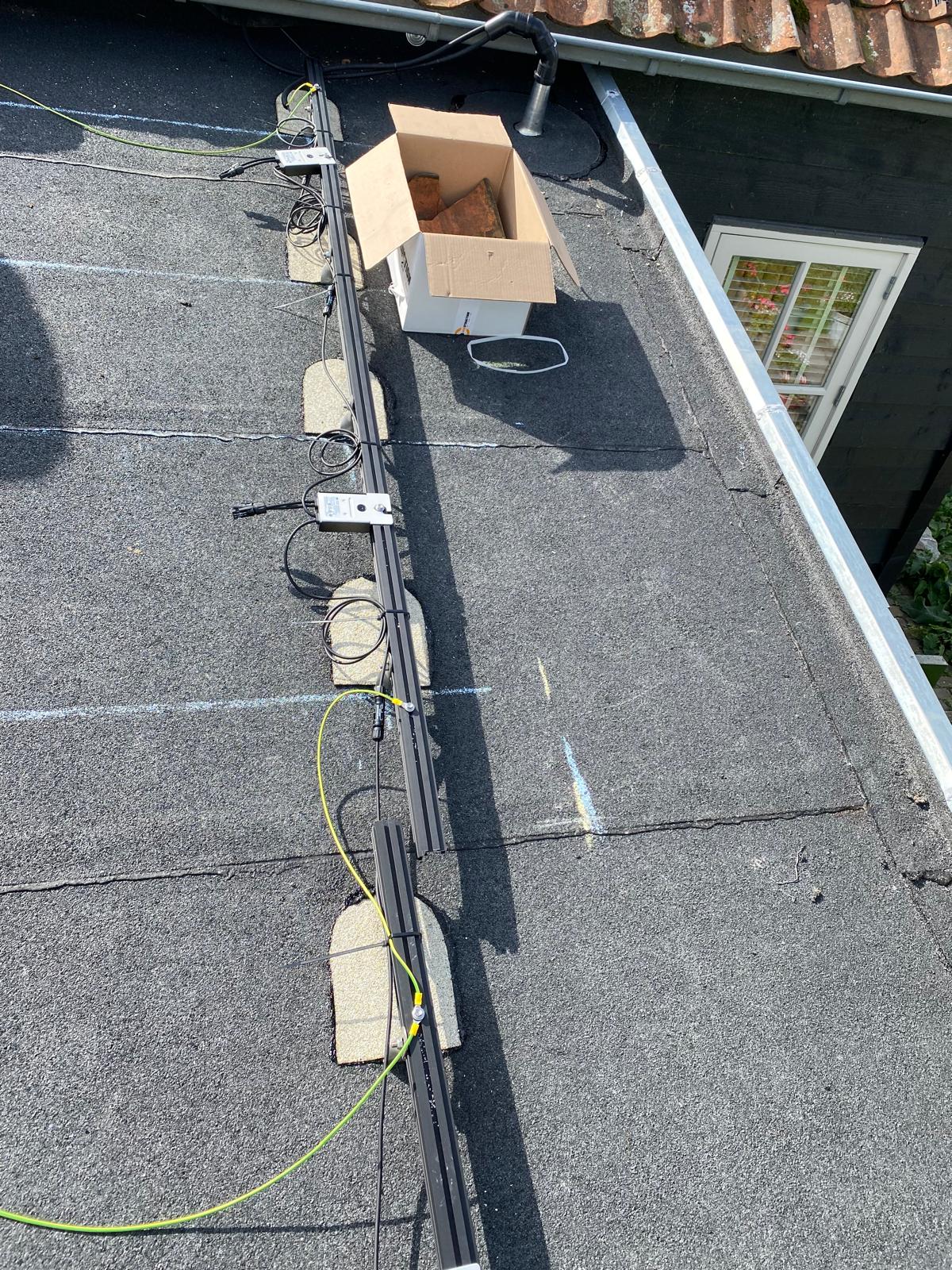 Vrij hoog gebouw, dus worden de panelen met een lift omhoog gebracht. Bij een plat dak moet er vrijwel altijd een gat geboord om de kabels het huis in te krijgen, zodat de panelen op de meterkast kunnen worden aangesloten. We noemen dat een dakdoorvoer. We kiezen altijd een plek die het meest logisch is ten opzichte van de meterkast, een optimale kabelroute zoeken we. En we doen dit in overleg met onze klant. En natuurlijk zorgen we ervoor dat rondom het gat geen lekkage kan ontstaan