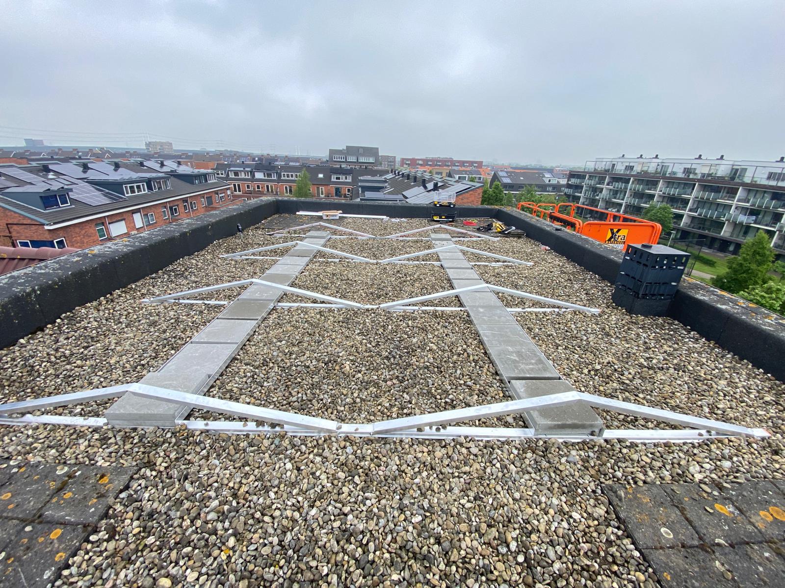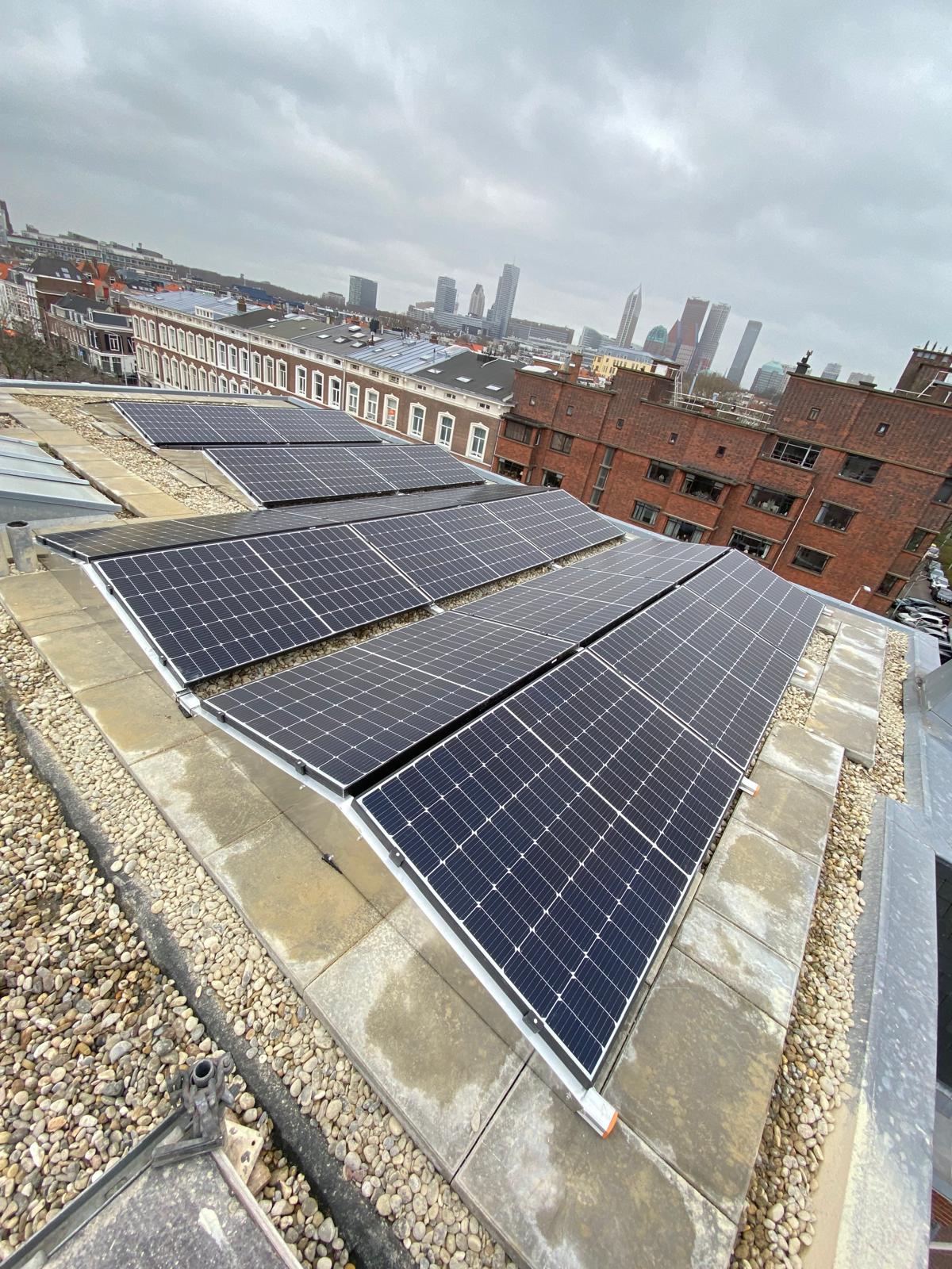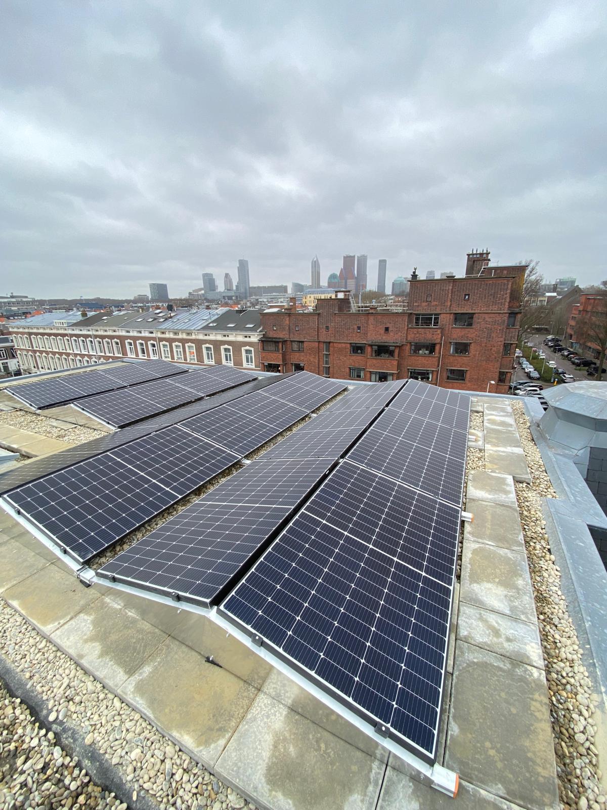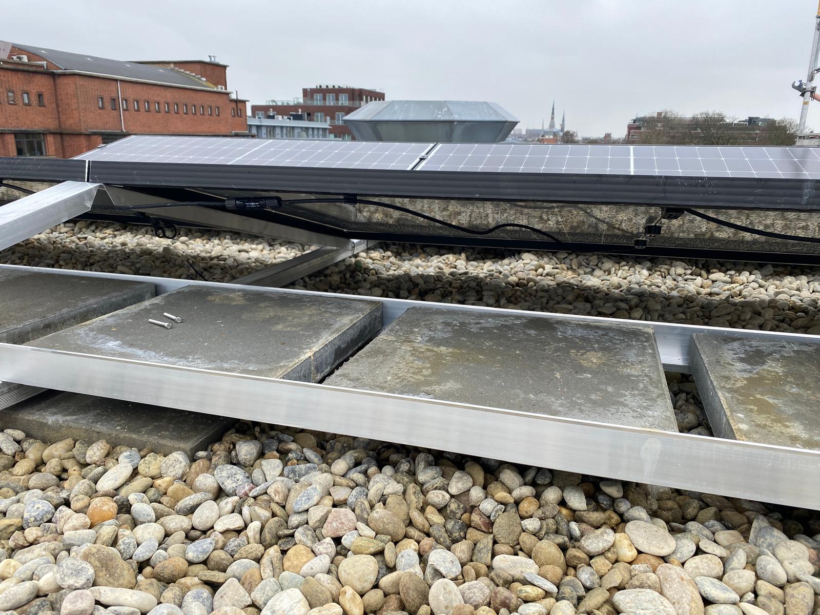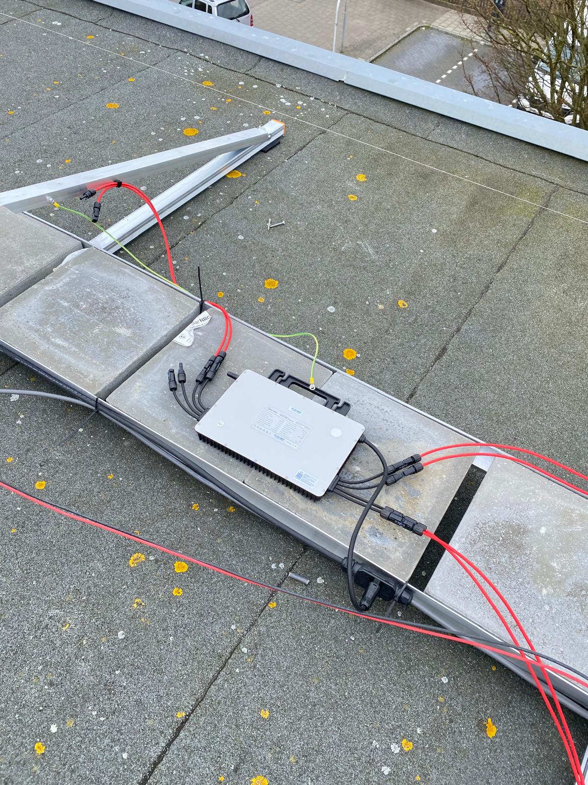 Vrij hoog gebouw, dus worden de panelen met een lift omhoog gebracht. Bij een plat dak moet er vrijwel altijd een gat geboord om de kabels het huis in te krijgen, zodat de panelen op de meterkast kunnen worden aangesloten. We noemen dat een dakdoorvoer. We kiezen altijd een plek die het meest logisch is ten opzichte van de meterkast, een optimale kabelroute zoeken we. En we doen dit in overleg met onze klant. En natuurlijk zorgen we ervoor dat rondom het gat geen lekkage kan ontstaan